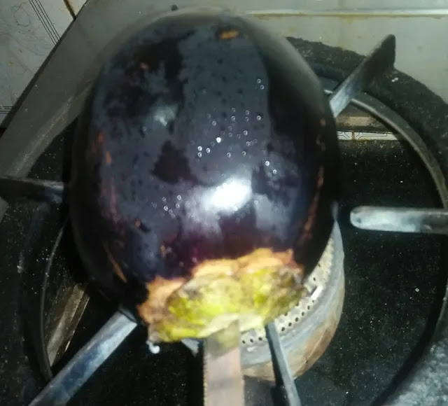 - Rinse the eggplant or Baingan and pat dry. Apply oil all over. Put the Baingan directly on heat and roast, turn it often and roast until completely roasted.