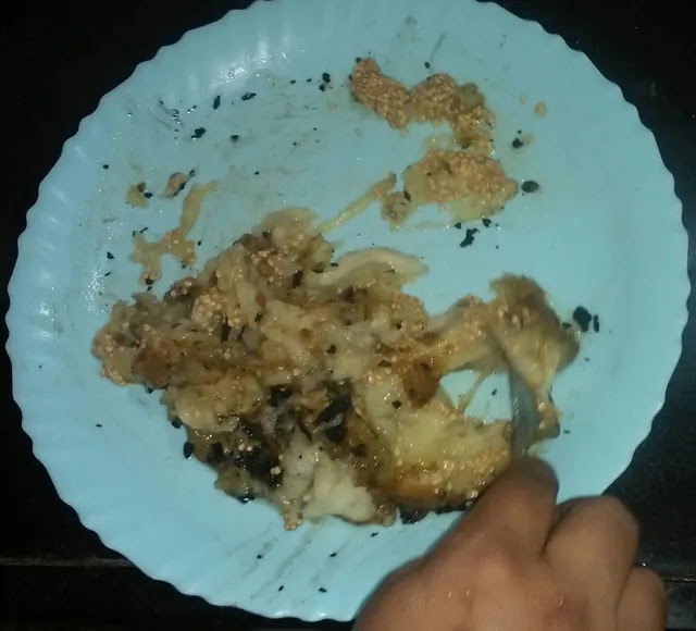 - Once Baingan is roasted (to check insert a knife inside the baingan, it should go easily) cool it completely.