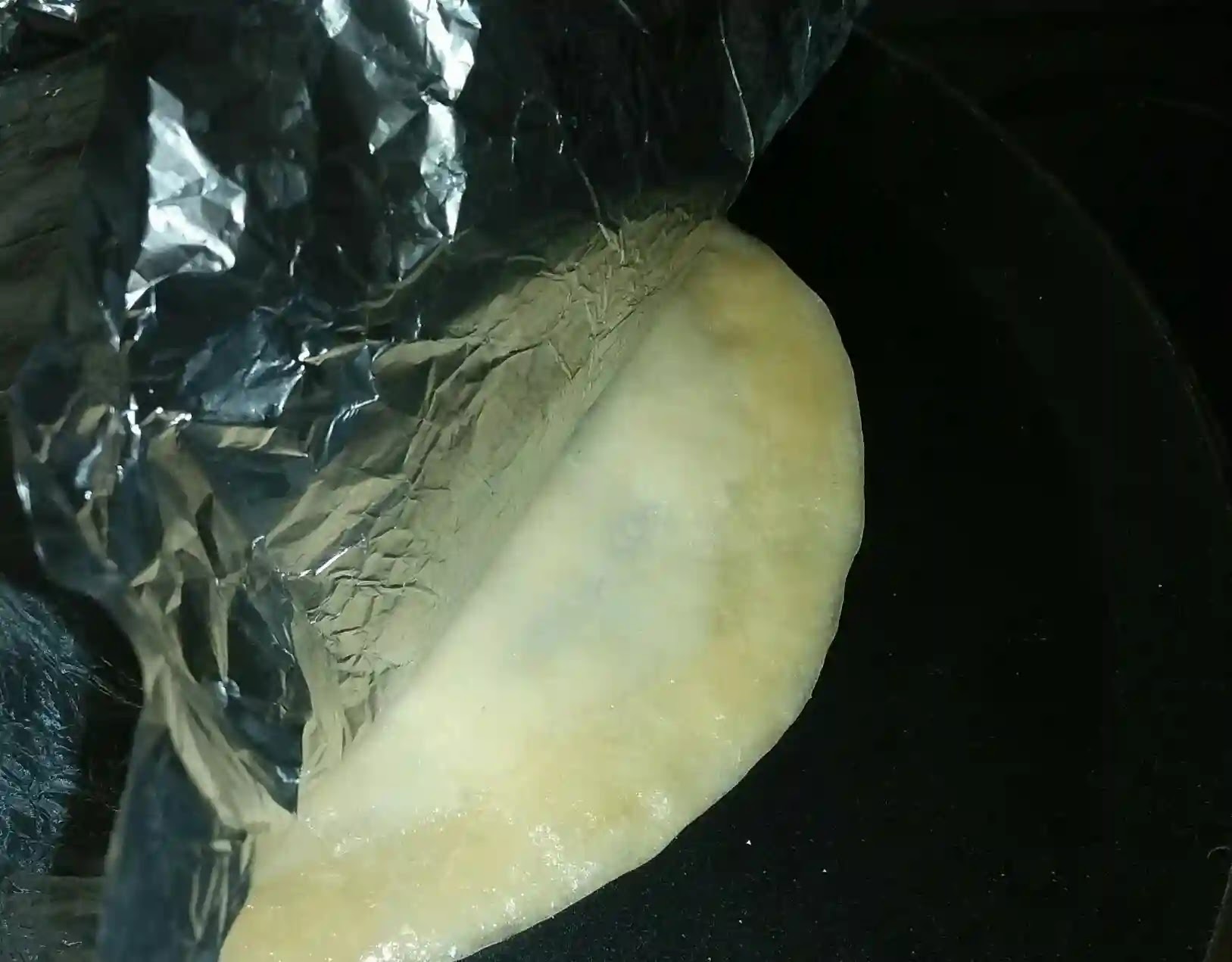 Place the holige along with foil on hot tawa. Remove the foil slowly.