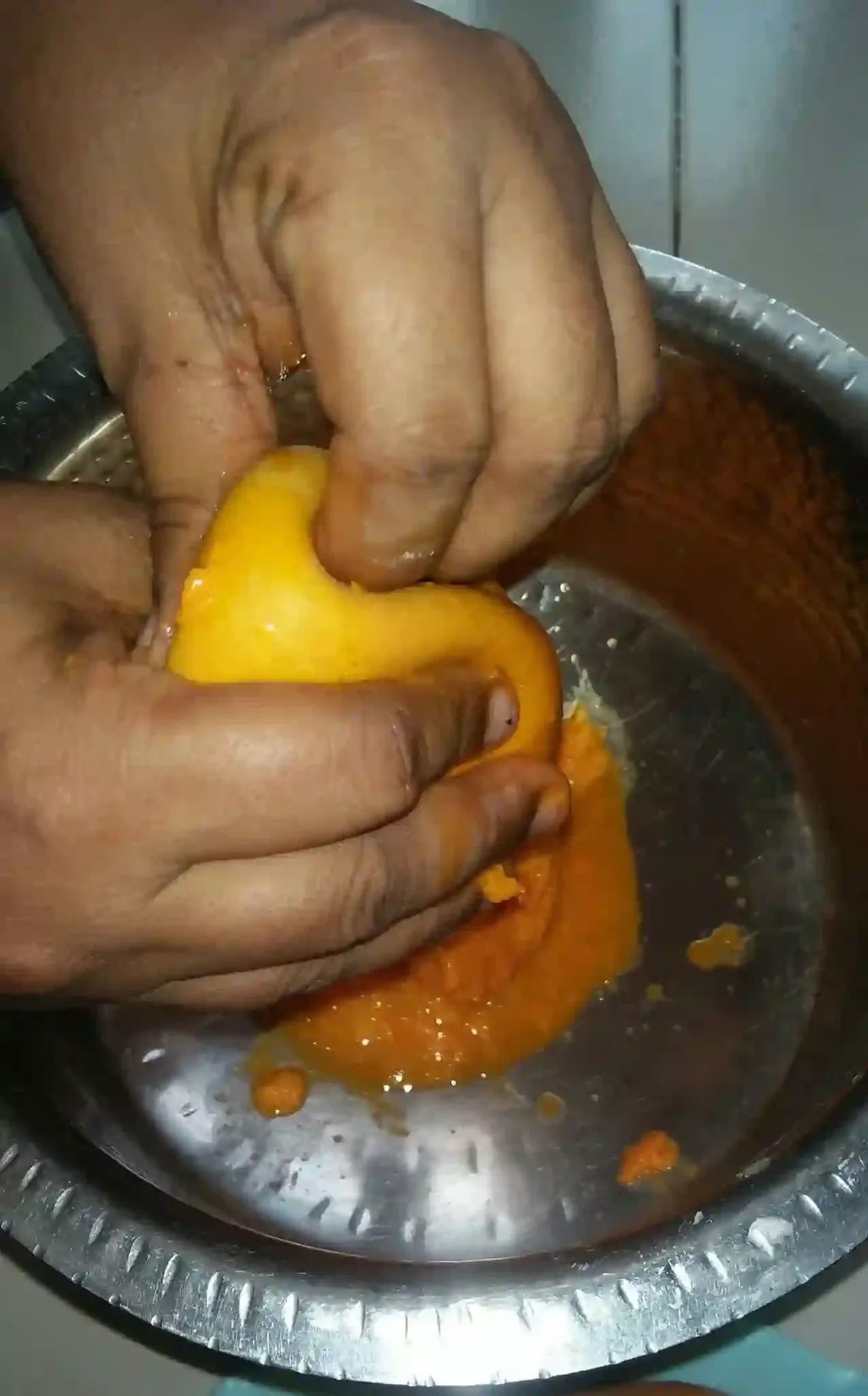 - Remove the pulp along with the seed from all the mangoes in the big utensil.