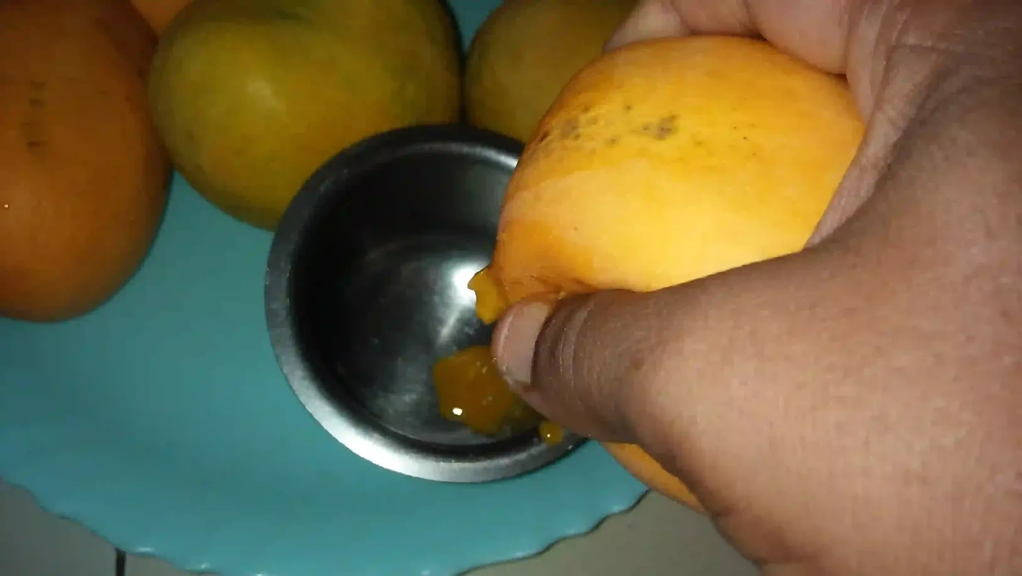 Wash mangoes and pat them dry. In a small bowl remove the tip and pinch out the initial juice of the mangoes.