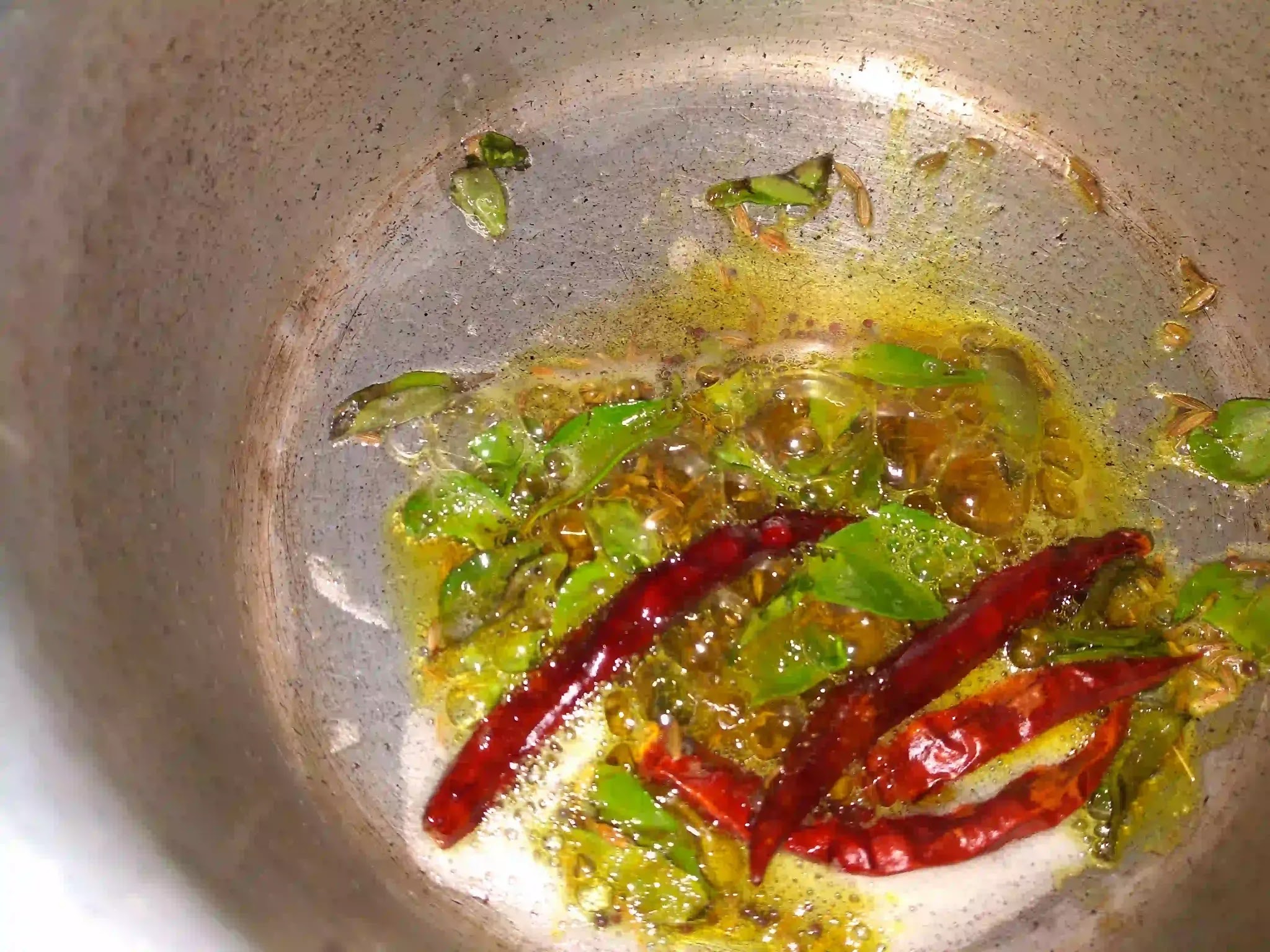 Add tempering ingredients, kadi patta and red chili and fry them.