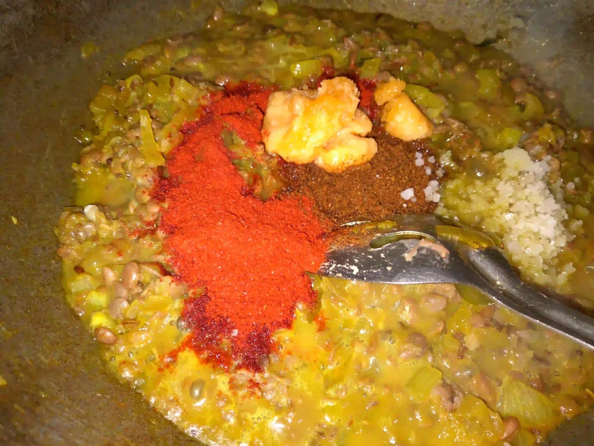 • Then add chili powder, masala powder, jaggery and salt. Again, mix well and cook for five minutes on medium flame.