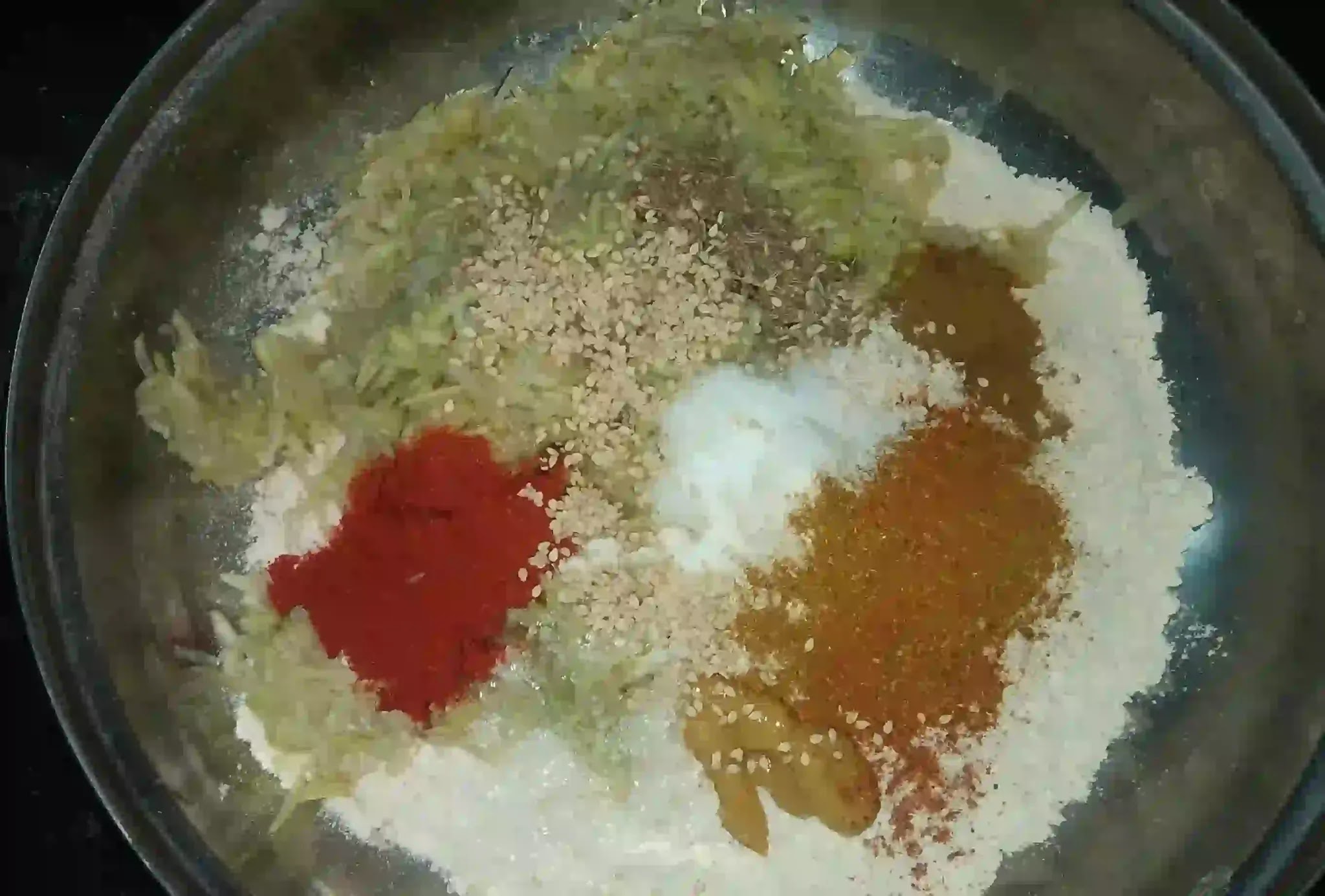 - Add all these to the wheat flour along with salt, ginger garlic paste, jeera powder, coriander powder, haldi powder, hing, White sesame and garam masala.