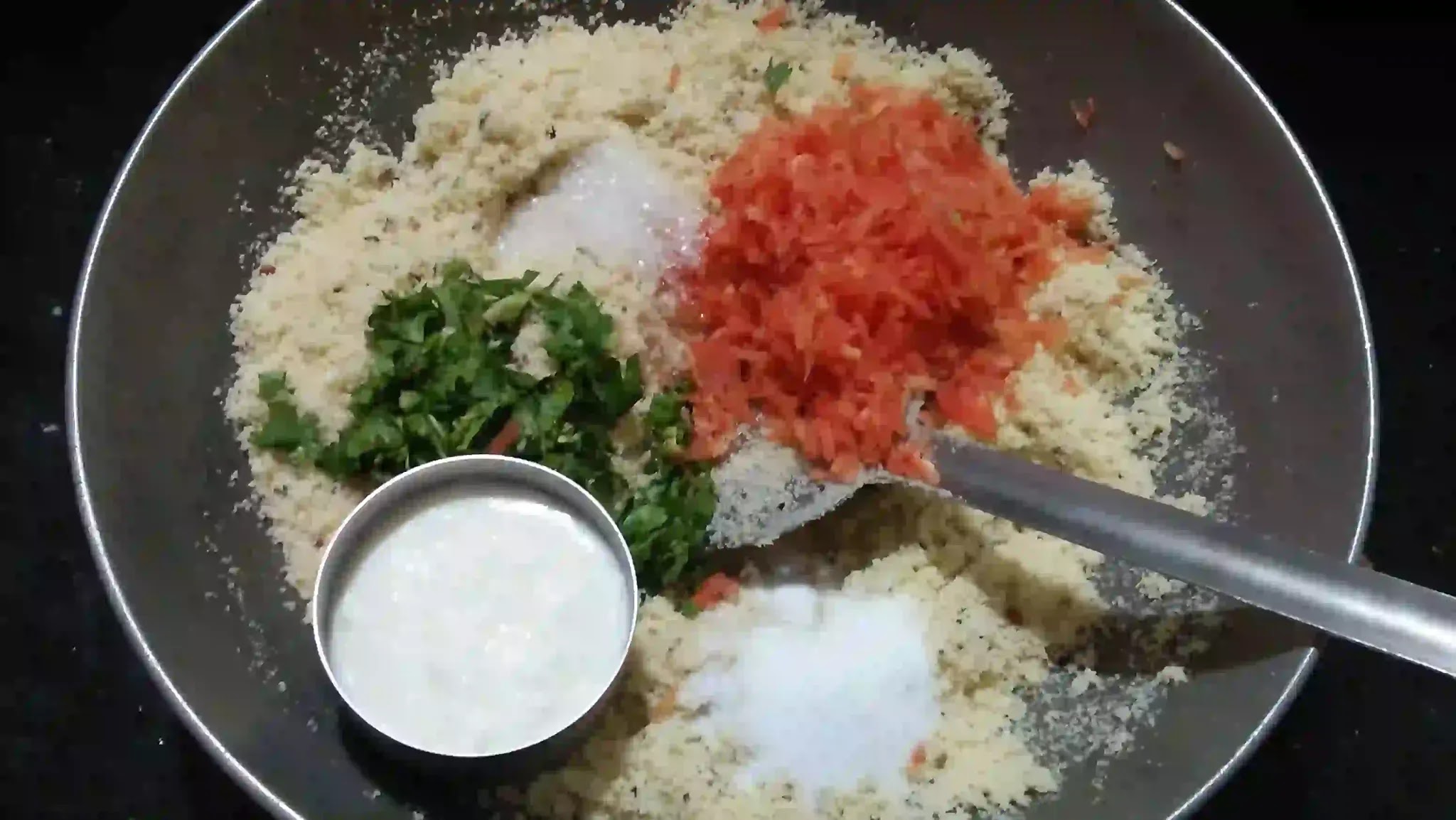 - Switch off the gas and take off kadai from the stove. Add curd, grated carrot, coriander, curry leaves salt and sugar. Mix it well so that no lumps are formed. Add water to adjust the consistency of the batter. Cover it and keep it aside for 15 minutes.