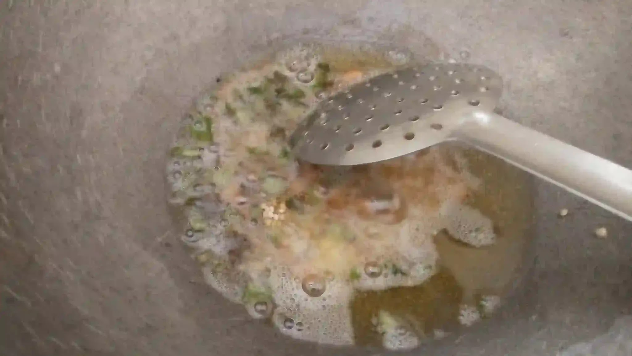 - Take a Kadai and put the oil in it. When it is warm add Mustard and jeera, splutter them. Then add Chana Dal, Urad Dal and Peanuts and fry them till they are pink. Add pinch of hing and curry leaves.