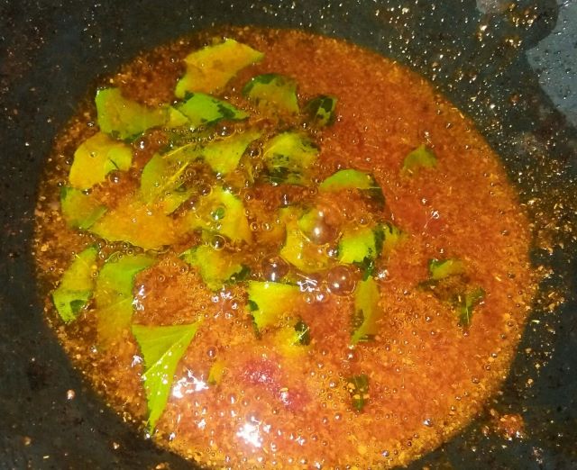 In a small kadai add one spoon butter or ghee. Add mustard and splutter. Then add one tea spoon red chili powder. Pour the whole tempering on the Tomato kaju gravy.