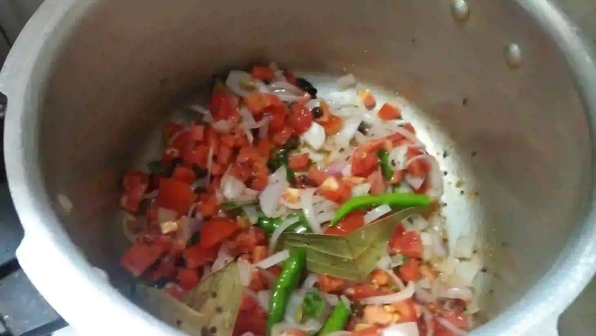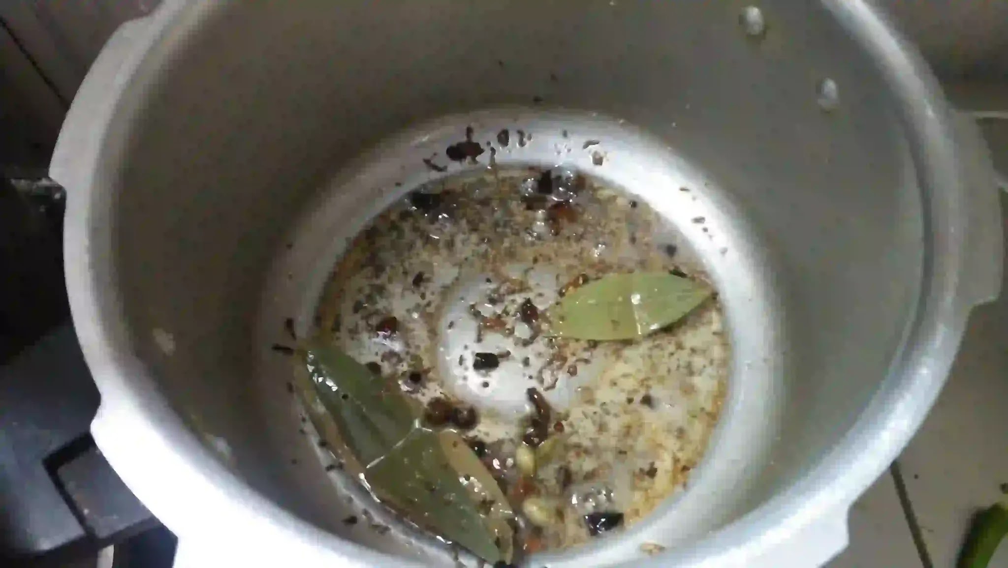 Take a cooker and add oil or ghee to it. Put all the whole masalas to it when oil is warm. Sauté them for 1 min.